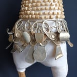 a figure made with vintage cotton fabric, found bone, reclaimed bone beads, driftwood and found ring pulls.